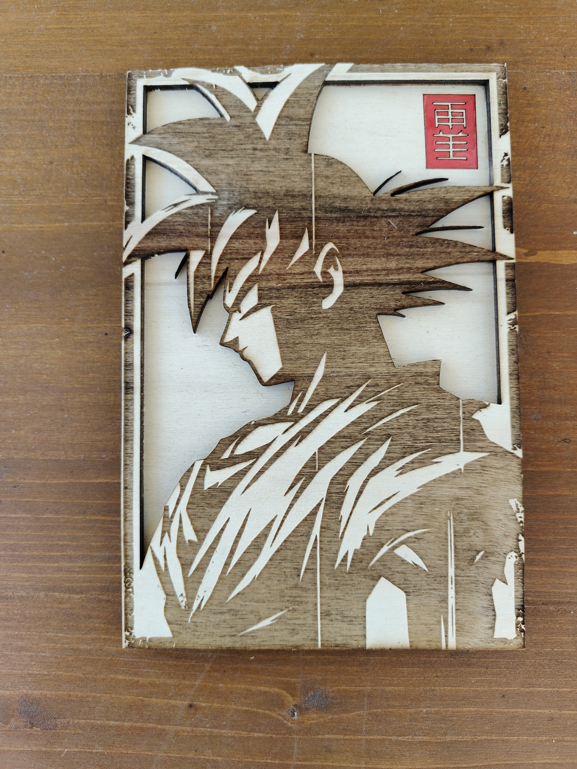 Scopri il nostro quadretto artigianale a tema Dragon Ball, realizzato interamente in legno e inciso con stampante laser. La silhouette del volto di Goku, il Saiyan più famoso di sempre, viene valorizzata dalla precisione dell’incisione e dalla qualità del legno naturale.